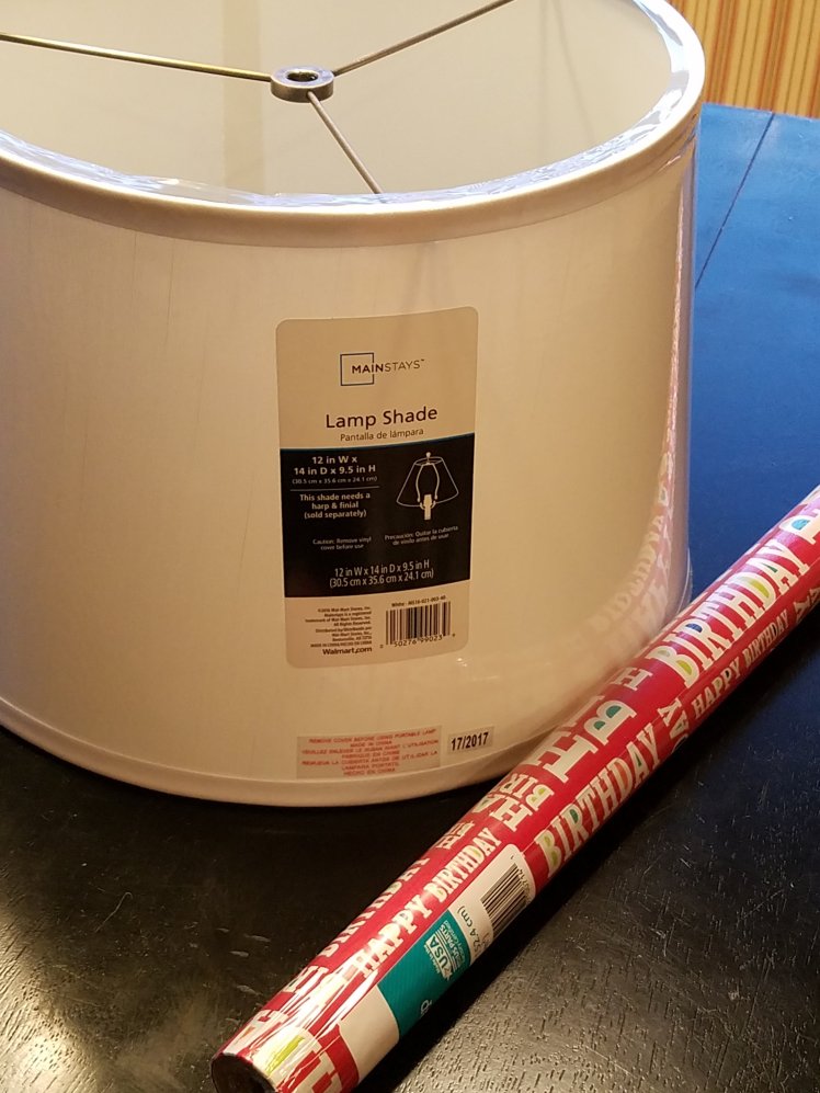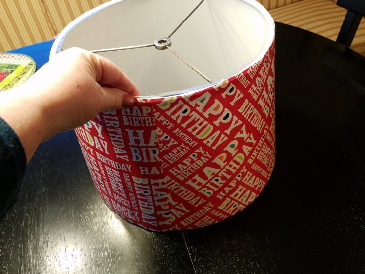 Any lampshade will do but white or some other light color would be best and the straighter the sides the better. So look for a drum style shade instead of a flared one. You can use a flared one but your fabric strips will just need to be wider to cover it and most of my scrap strips are my beloved 1 1/2″ wide strips.