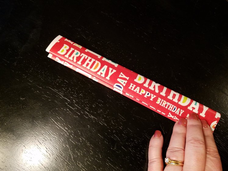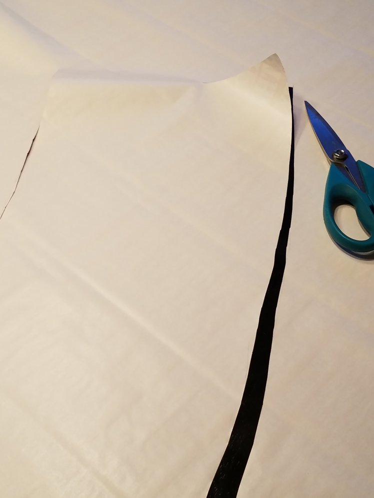 So pretty easy, especially if you’ve done some paper foundation piecing. The first step is to make your paper template. I like to use a roll of cheap, flimsy wrapping paper. It can be any color or design because it will get torn out after sewing all of your strips together. Flimsy wrapping paper can be frustrating when you’re trying to wrap a gift but tears away beautifully for this project. Lay out the wrapping paper and roll the lamp shade a full turn, tracing the top and bottom as you go.