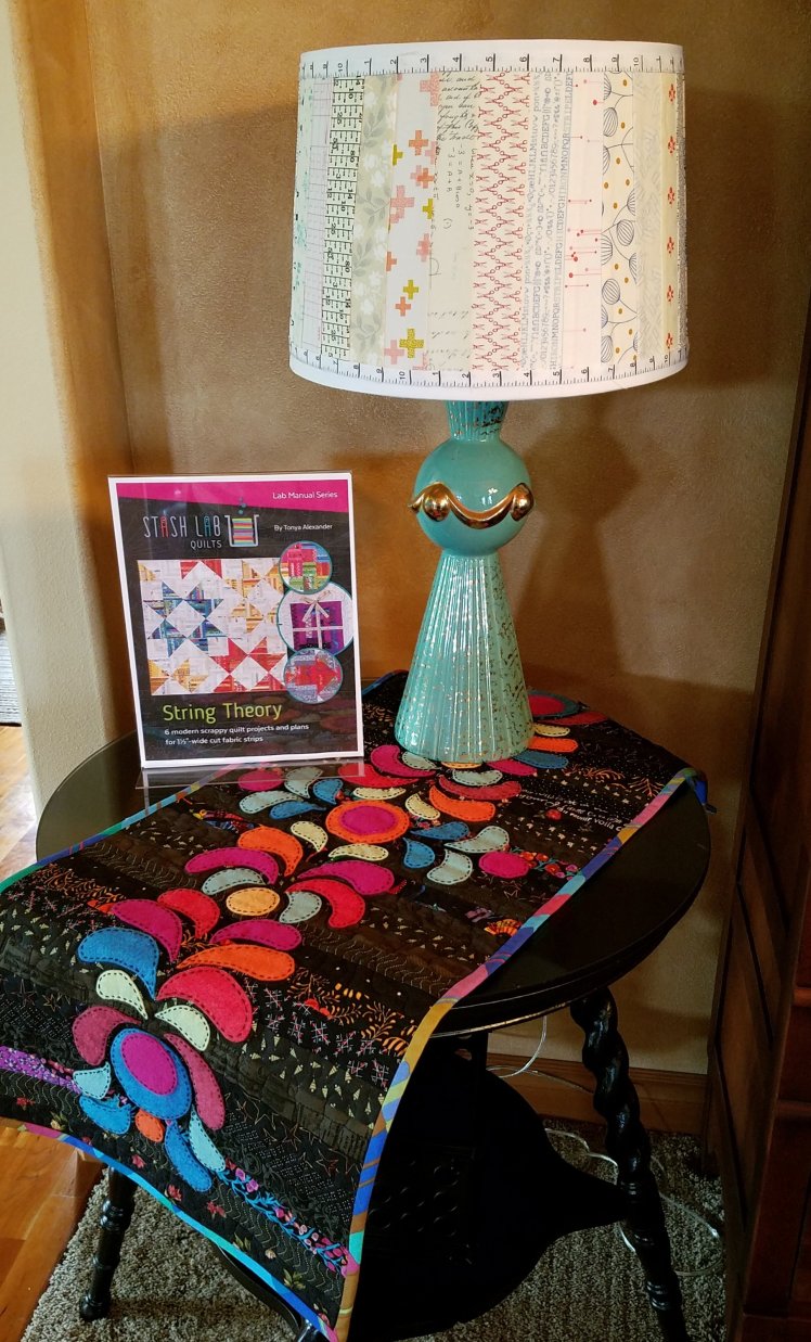 Last spring for quilt market, I featured low volume scrap strips on a lamp shade for my display table. After market, I gifted it to a friend (who happened to have lent me the lamp base!) How could I not? I loved it so much, I decided to make another one for my work desk in my studio space. After the chair project, this was a snap!