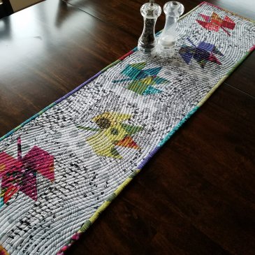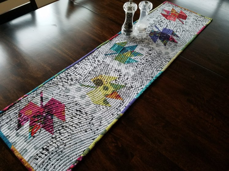 I added my go-to favorite quilting on this project – an echo quilted wavy line using the walking foot on my domestic machine. Choosing scrappy binding from all the bits leftover means you don’t have to pick just one! There are so many great choices in this line and it will look great on my dining room table.