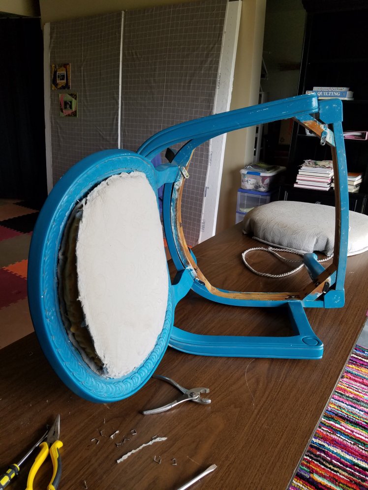 I found some home dec weight fabric and collected all of my supplies, including a new electric stapler. I was in no rush to get started but then on a recent weekend the power went out and since I couldn’t sew, I figured it was a great day for deconstruction of the chairs!