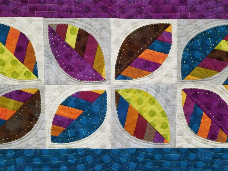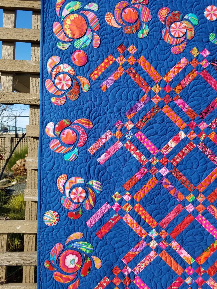 Now, winter weather and my schedule have not been great for getting a lot of outside quilt shots but I did luck out with a recent sunny day and ran out to put up my project “Happy Lattice” out in the garden to catch the sun. Beautiful quilting on this one by Tracey @thequiltingninja .